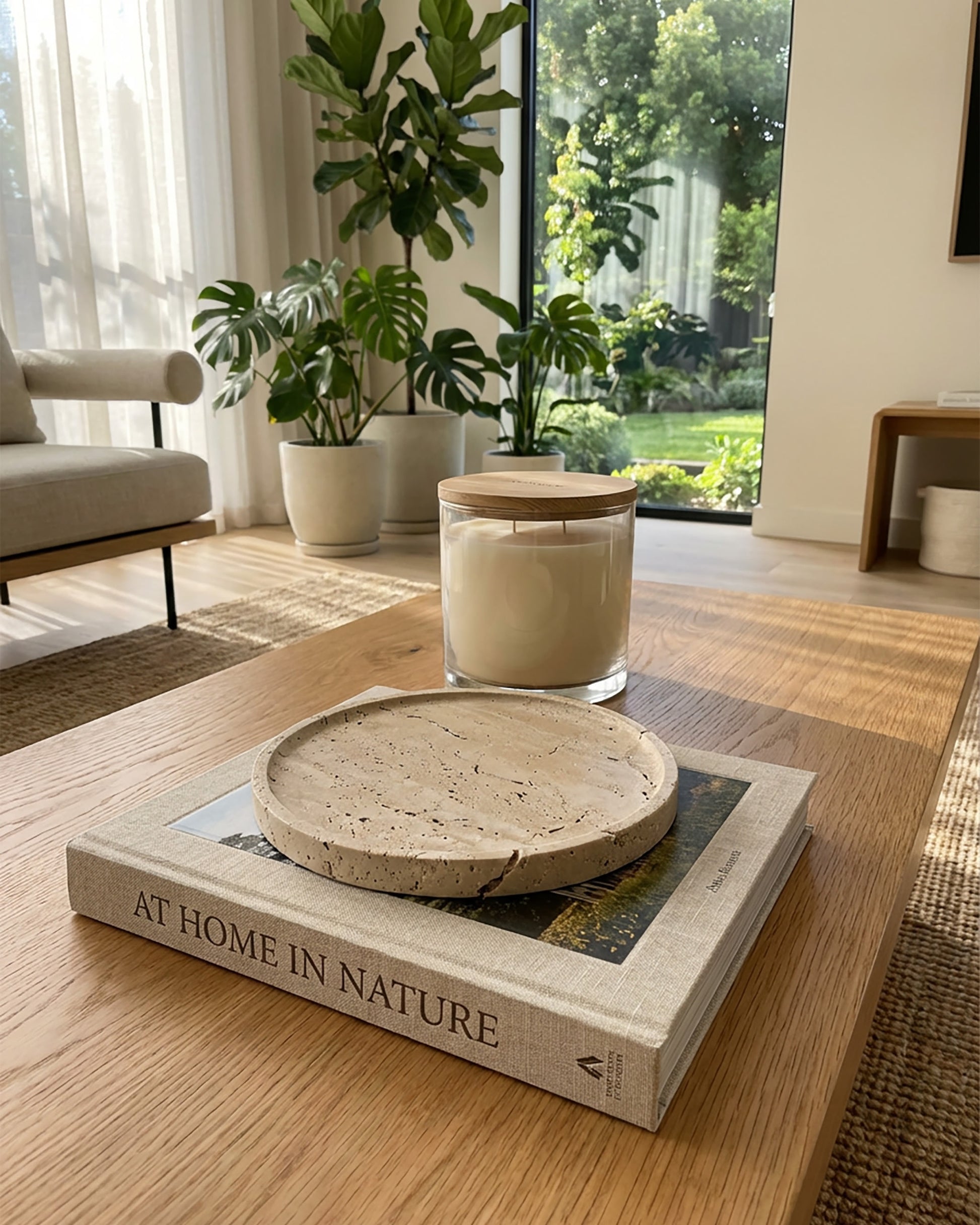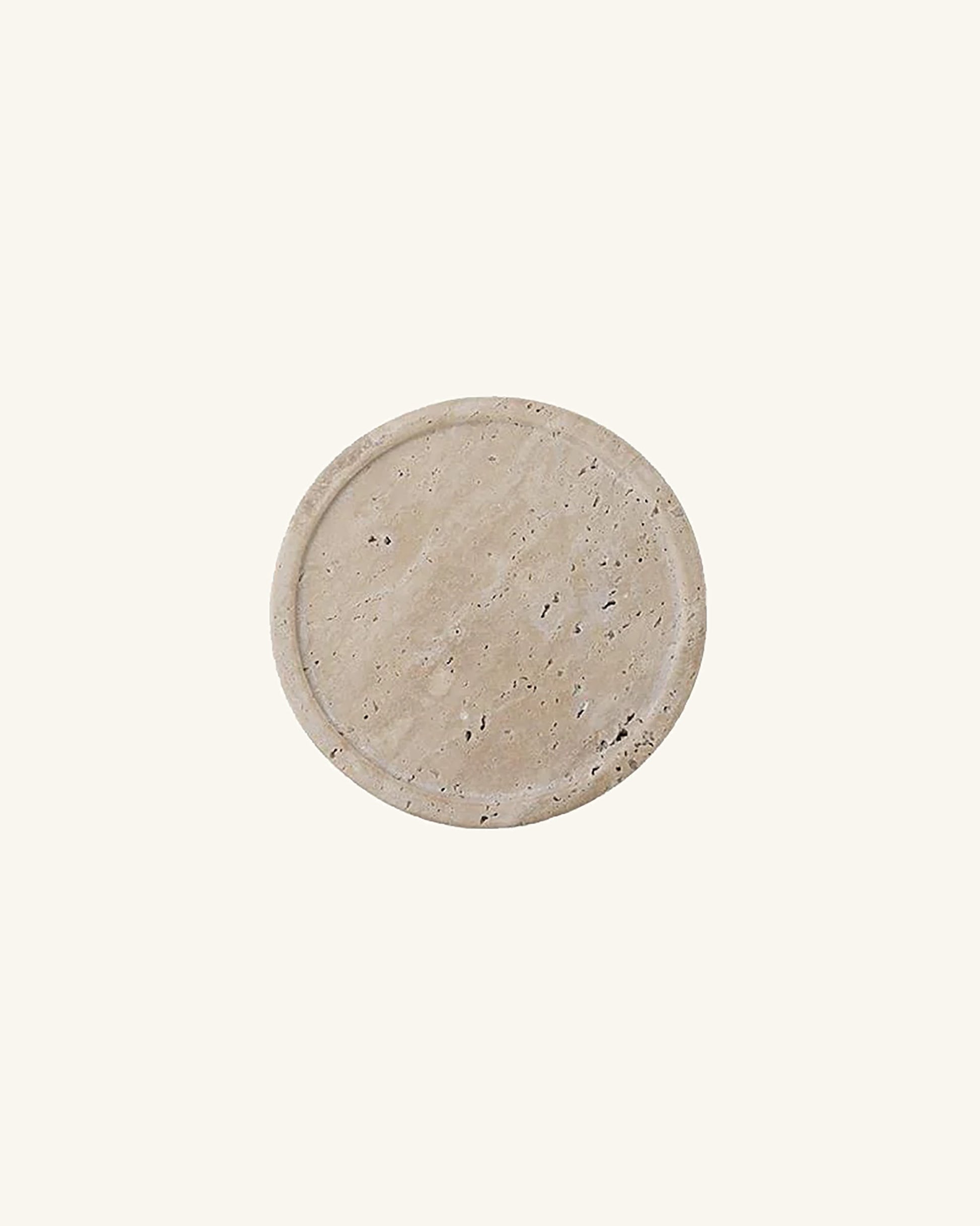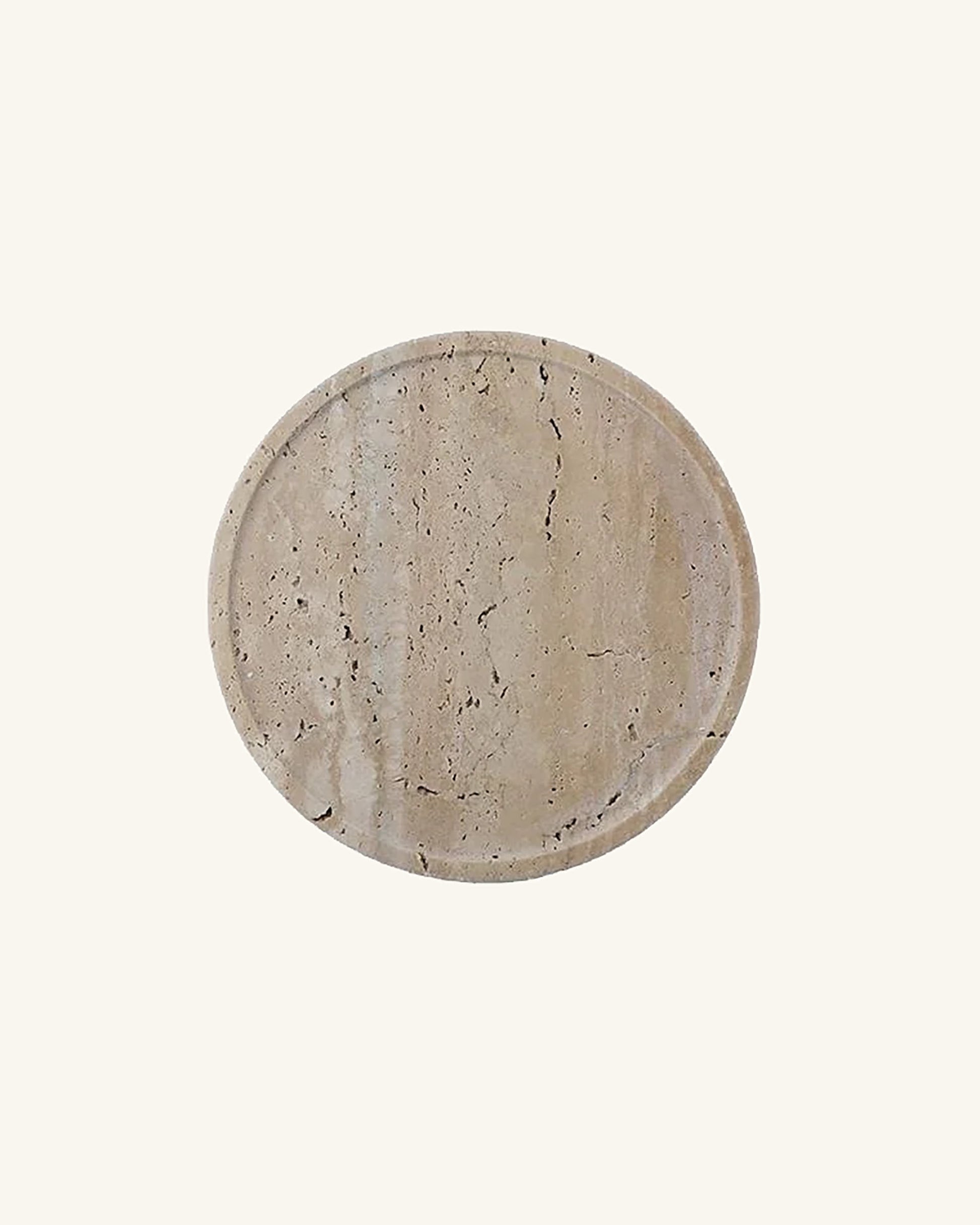Carved from natural travertine, this circular tray brings quiet luxury to any surface. The stone's organic veining ensures each piece is unique—a functional sculpture that elevates everyday moments. Use it to corral jewellery on a vanity, anchor a candle arrangement, or serve aperitifs with understated elegance.