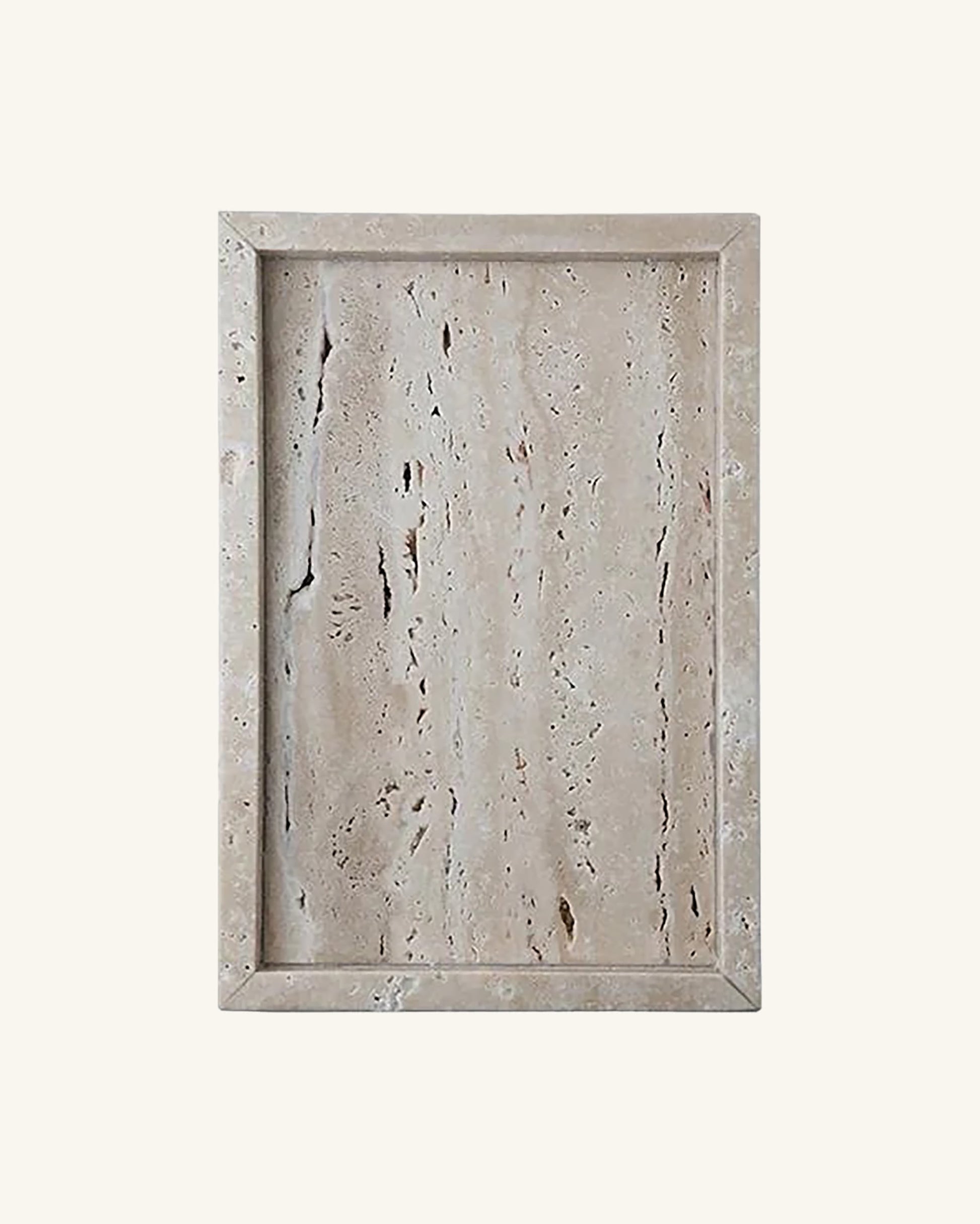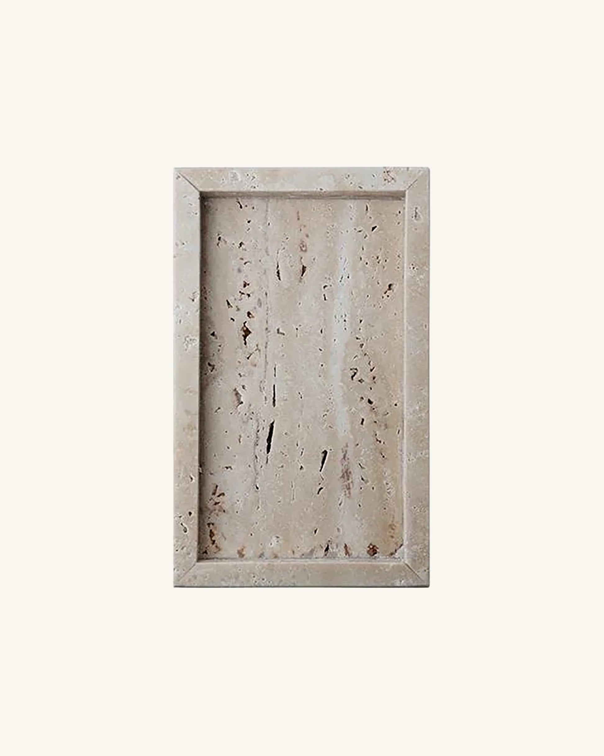 Carved from natural travertine, this rectangular tray brings quiet luxury to any surface. The stone's organic veining ensures each piece is unique. A functional sculpture that elevates everyday moments. Perfect for styling a console, organising bathroom essentials, or presenting canapés with understated elegance.